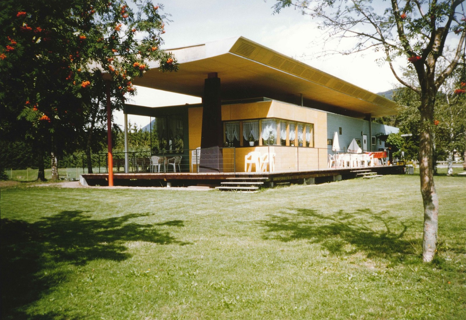 Im Sportareal von Reischach wird das veraltete Clubhaus der Tennisanlage mit sechs Plätzen durch einen Neubau ersetzt. Die weitläufige Sportzone mit Leichtathletikanlage, Fußballplätzen, Hallenschwimmbad, Golfplatz, Eisschnelllaufring, Reitstall und Spielplatz liegt frei auf dem Reischacher Hochplateau. Das neue Clubhaus folgt dem Pavillonprinzip, bei dem jede Funktion in einem eigenen kleinen Baukörper untergebracht ist. Der langgestreckte, leicht aus der Achse gedrehte Neubau orientiert sich besser zu den Tennisplätzen und wird von einem schwebenden Flugdach überdeckt, das Leichtigkeit verleiht und zugleich als Schutz vor Sonne und Witterung dient. Um die Belichtung und Belüftung des Untergeschosses zu verbessern, ist das Gebäude um 60 cm über dem Gelände angehoben. Unten liegen Umkleiden, Lagerräume, Technik und ein Raum für den Tennislehrer; oben eine klare Holzkonstruktion mit großen Glasflächen und einer großzügigen Schiebetür zur Terrasse. Das massive Untergeschoss aus Beton trägt einen Holzriegelbau mit Flugdach aus Holzleimbindern. Linoleum und geschliffener Estrich prägen die Innenräume. Ein Energiekonzept mit großem Dachüberstand und Solarkollektoren sorgt für Effizienz im Sommer wie im Winter.