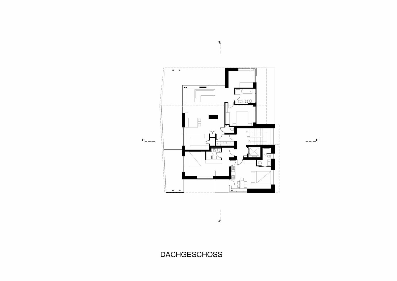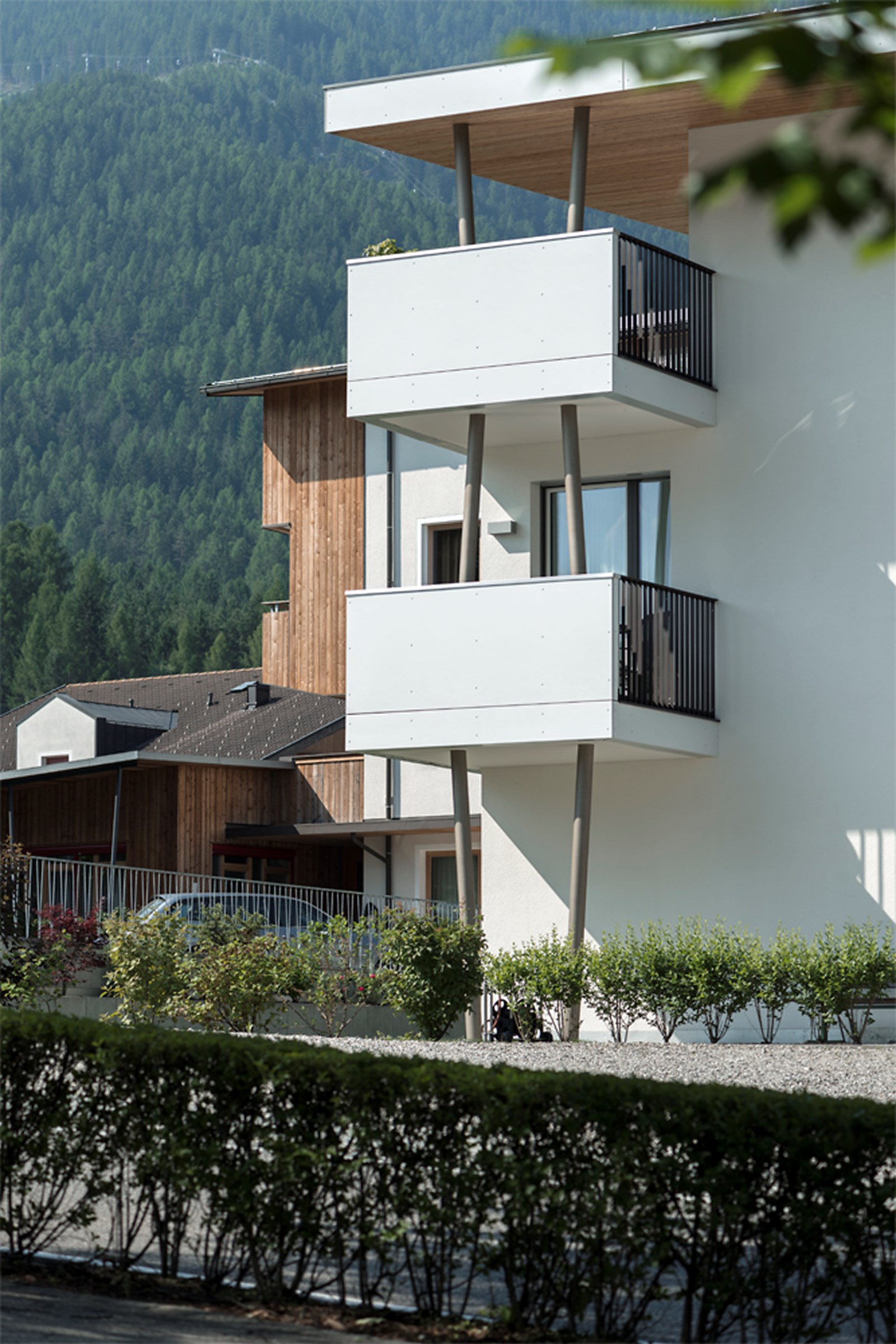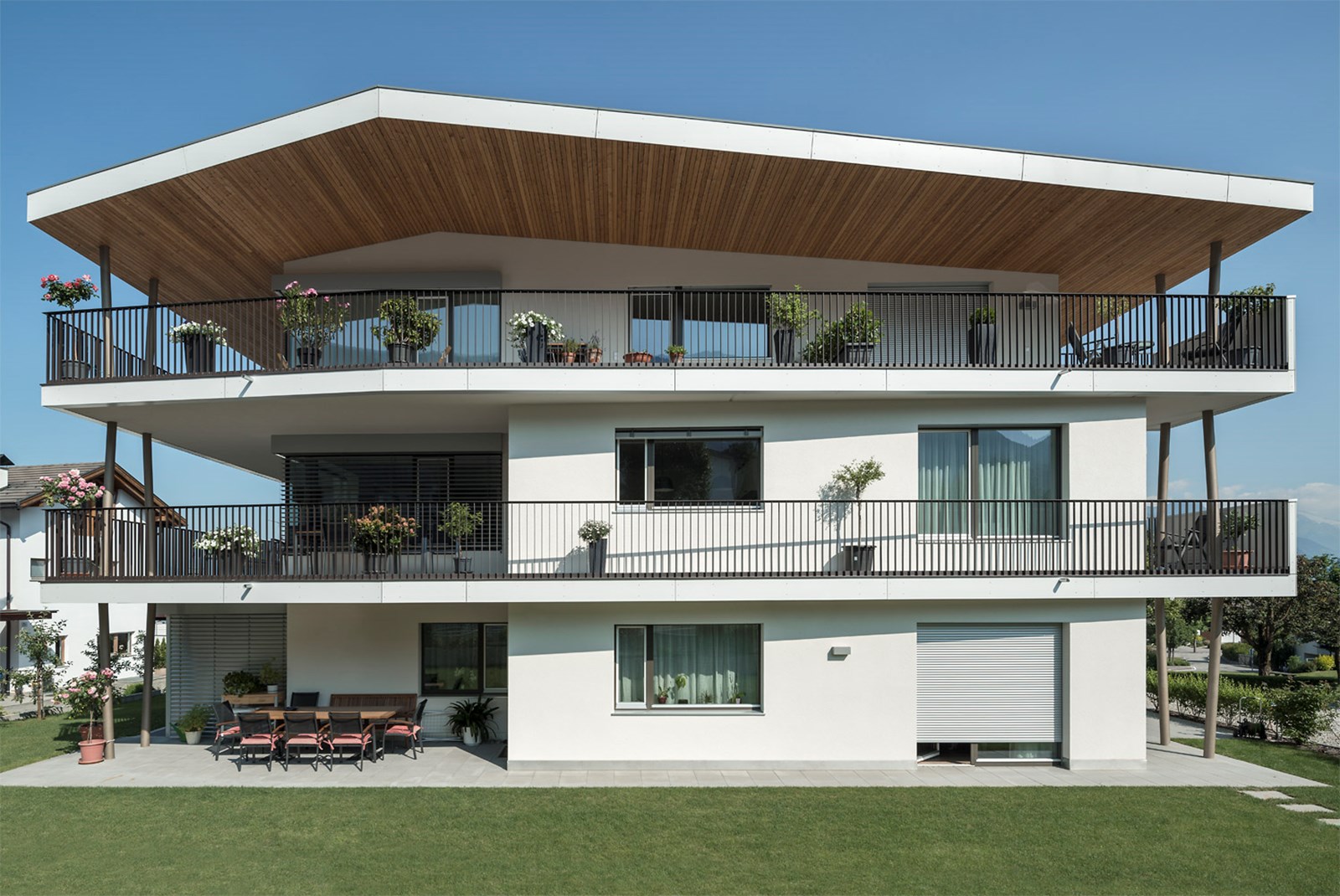 Architektonisch präsentiert sich das Haus als schlichter, solitärer Baukörper mit klassischem Satteldach. Großzügige Terrassen, Loggien und Balkone glätten die Vor- und Rücksprünge des Volumens und schaffen eine harmonische, geschlossene Silhouette. Gleichzeitig öffnen sie die Innenräume zum Licht und zur Umgebung, verweben das Gebäude subtil mit dem alpinen Landschaftsraum und verleihen dem Neubau eine klare, einladende Identität.