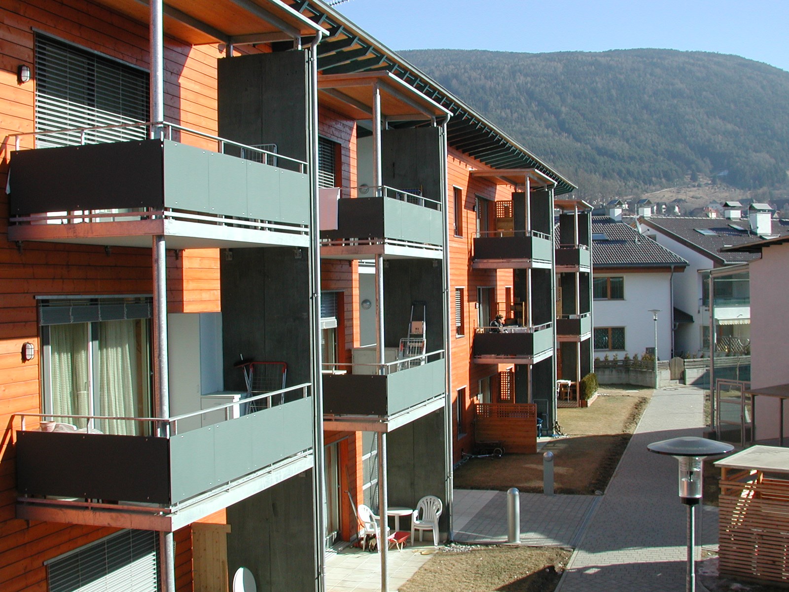 In Bruneck entstanden für das Wohnbauinstitut 24 Wohnungen, die Einheiten verteilen sich auf zwei Häuser mit je 12 Wohnungen und werden über 3-geschossige Laubengänge erschlossen, die wettergeschützte Begegnungsräume schaffen und zum Austausch unter den Bewohnern einladen. Jede Wohnung verfügt über Terrasse oder Balkon und ist nach Süden oder Westen ausgerichtet, wodurch Licht und Ausblick optimal genutzt werden. Die Gebäudehüllen sind energieeffizient gestaltet, helle Materialien und großzügige Öffnungen erzeugen eine freundliche, offene Atmosphäre. Nachträglich wurde die Zertifizierung als KlimaHaus B erlangt, was den hohen Standard an Komfort, Nachhaltigkeit und Lebensqualität unterstreicht.